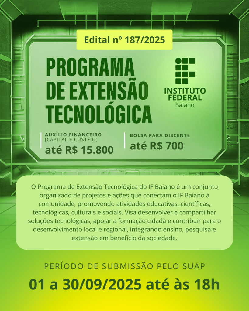 O Programa de Extensão Tecnológica tem como objetivo apoiar projetos de extensão que envolvam atividades de caráter educativo, científico, tecnológico, cultural, esportivo e artístico, desenvolvidos pelo IF Baiano em prol e em parceria com a comunidade, contribuindo para a formação integral e cidadã e apoiando a articulação Instituto-Sociedade.