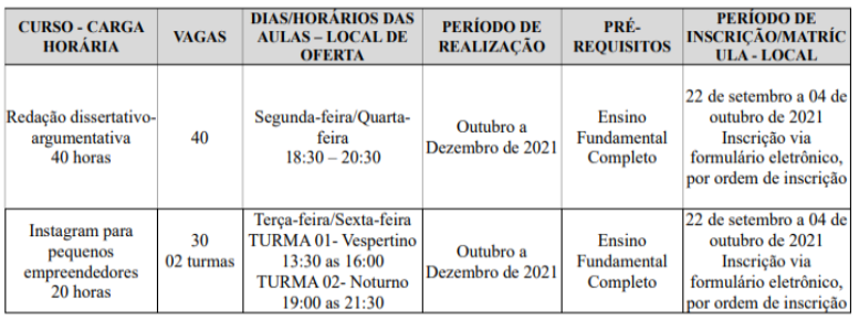 São 40 vagas para o curso Redação dissertativo-argumentativa e 30 vagas para o curso Instagram para pequenos empreendedores.
