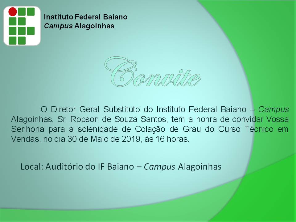 O Campus Alagoinhas tem a honra de convidar toda a comunidade interna, seus servidores e estudantes, bem como familiares e amigos para a solenidade de Colação de Grau do Curso Técnico em Vendas a ser realizado no dia 30 de maio de 2019, às 16 horas, em seu Auditório.