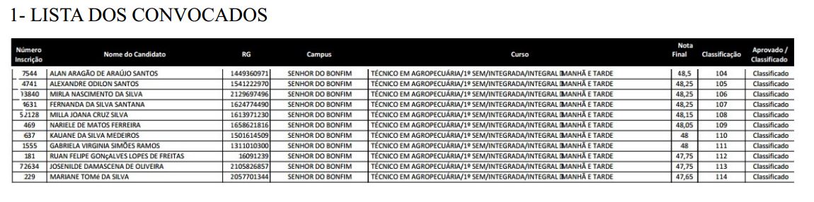 O Diretor Geral do Campus Senhor do Bonfim, no uso de suas atribuições legais, convoca os candidatos relacionados no presente edital do curso Técnico Agrícola com Habilitação em Agropecuária Integrado ao Ensino Médio, para efetuarem a matrícula referente às vagas remanescentes do Processo Seletivo 2014.