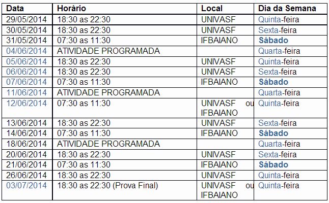 Os discentes também poderão efetivar matrícula no primeiro dia de aula que será no dia 29 de maio, na Universidade Federal do Vale do São Francisco (UNIVASF) até às 19:00h, com o Prof. José Honorato.