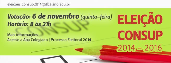 A Comissão Eleitoral Geral convida a comunidade acadêmica para participar da eleição dos candidatos Docentes, Discentes, Técnicos e Egressos ao Conselho Superior do IF Baiano – Biênio 2014-2016. A votação ocorrerá amanhã, dia 06 de Novembro, das 08h às 21h, em todos os Campi e Reitoria. Para votar, os eleitores deverão portar documento de identificação com foto. Para maiores informações entrar em contato com a Comissão Eleitoral Local ou acessar o site do IF Baiano.