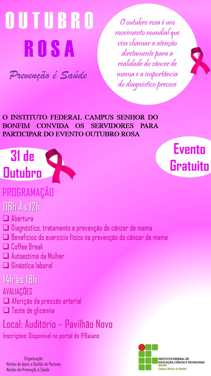 O IF Baiano Campus Senhor do Bonfim realizará o evento “Outubro Rosa – Prevenção é saúde” no dia 31 de outubro, das 08:00h às 12:00h, com uma programação alusiva ao mês de campanha.
