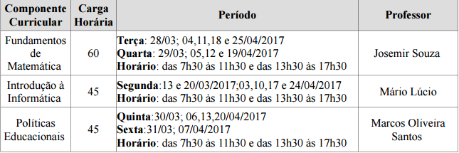 O Diretor Geral do Instituto Federal de Educação, Ciência e Tecnologia Baiano, Campus Senhor do Bonfim/BA, no uso de suas atribuições legais, RESOLVE: 1. Convocar os discentes do curso de Licenciatura em Ciências Agrárias que tenham interesse em efetuar matrícula nos componentes curriculares abaixo identificados, para comparecerem à Secretaria de Registros Acadêmicos deste Campus, munidos de documento oficial com foto, do dia 20 a 23 de fevereiro de 2017, das 8h às 22h, para solicitarem matrícula. O início das aulas está previsto para o dia 13 de março de 2017.
