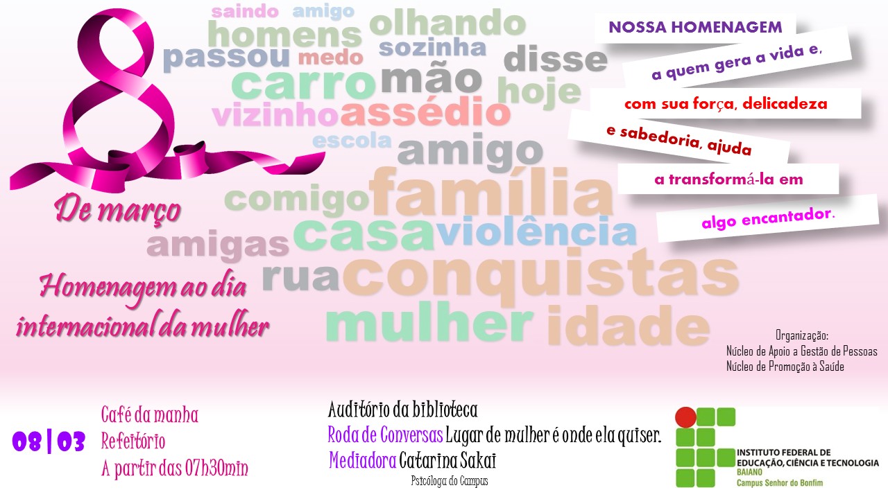 Em homenagem ao Dia Internacional da Mulher: O Instituto Federal Baiano – Campus Senhor do Bonfim realizará o evento “Dia Internacional da Mulher”, no dia 08 de março, a partir das 7h30.