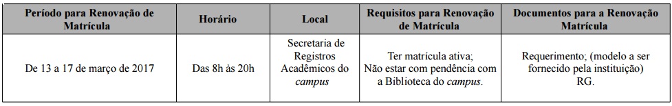 A renovação de matrícula poderá ser feita por procurador legalmente constituído, desde que atendidos os requisitos e documentos necessários à sua efetivação. O Início das aulas do período 2017.1 está previsto para o dia 15/05/2017. Em caso de mudança dessa data, divulgar-se-á, posteriormente, uma nova data na página oficial do Campus.