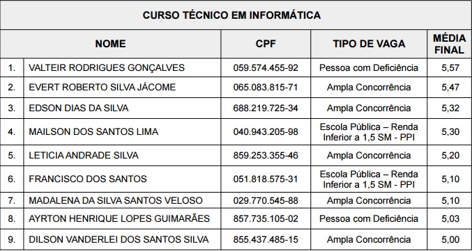 4ª CONVOCAÇÃO DE MATRÍCULA PARA VAGAS REMANESCENTES – INFORMÁTICA (1)