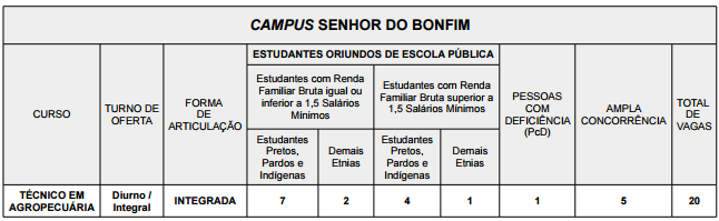 O Diretor Geral do Instituto Federal de Educação, Ciência e Tecnologia Baiano – Campus Senhor do Bonfim, torna público o aditamento de 20 vagas ao quantitativo previsto no Edital nº 61, de 05 de setembro de 2016, destinado ao Processo Seletivo para Ingresso de Estudantes em 2017 nos Cursos da Educação Profissional Técnica de Nível Médio, na forma Integrada, cujo extrato foi publicado no Diário Oficial da União de 09/09/2016, e retificações posteriores, para convocação de candidatos aprovados no Cadastro de Reserva do referido processo seletivo, observando o seu prazo de validade de acordo item 13.8. do citado edital.