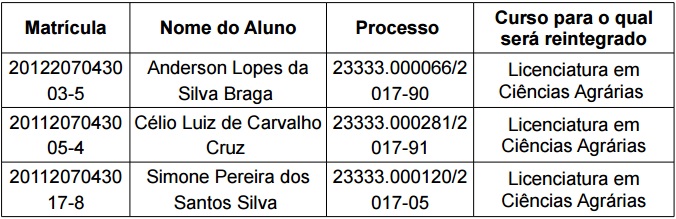 O DIRETOR GERAL DO INSTITUTO FEDERAL DE EDUCAÇÃO, CIÊNCIA E TECNOLOGIA BAIANO/CAMPUS SENHOR DO BONFIM, no uso de suas atribuições legais, considerando a Lei 9.784/99, que trata do processo administrativo no âmbito da administração pública federal, bem como o Art. 46, da Organização Didática dos Cursos da Educação Superior deste Instituto (ODES), aprovada pelo Conselho Superior, através da Resolução nº 19, em 22 de outubro de 2010, posteriormente, revisada e aprovada pela Resolução nº 18, em 31 de outubro de 2012, em vista da conclusão dos processos de Reintegração ao Curso,
