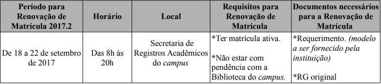 6. O início das aulas do período 2017.2 está previsto para o dia 09/10/2017. 7. As dúvidas concernentes ao disposto neste edital poderão ser dirimidas na SRA do campus.