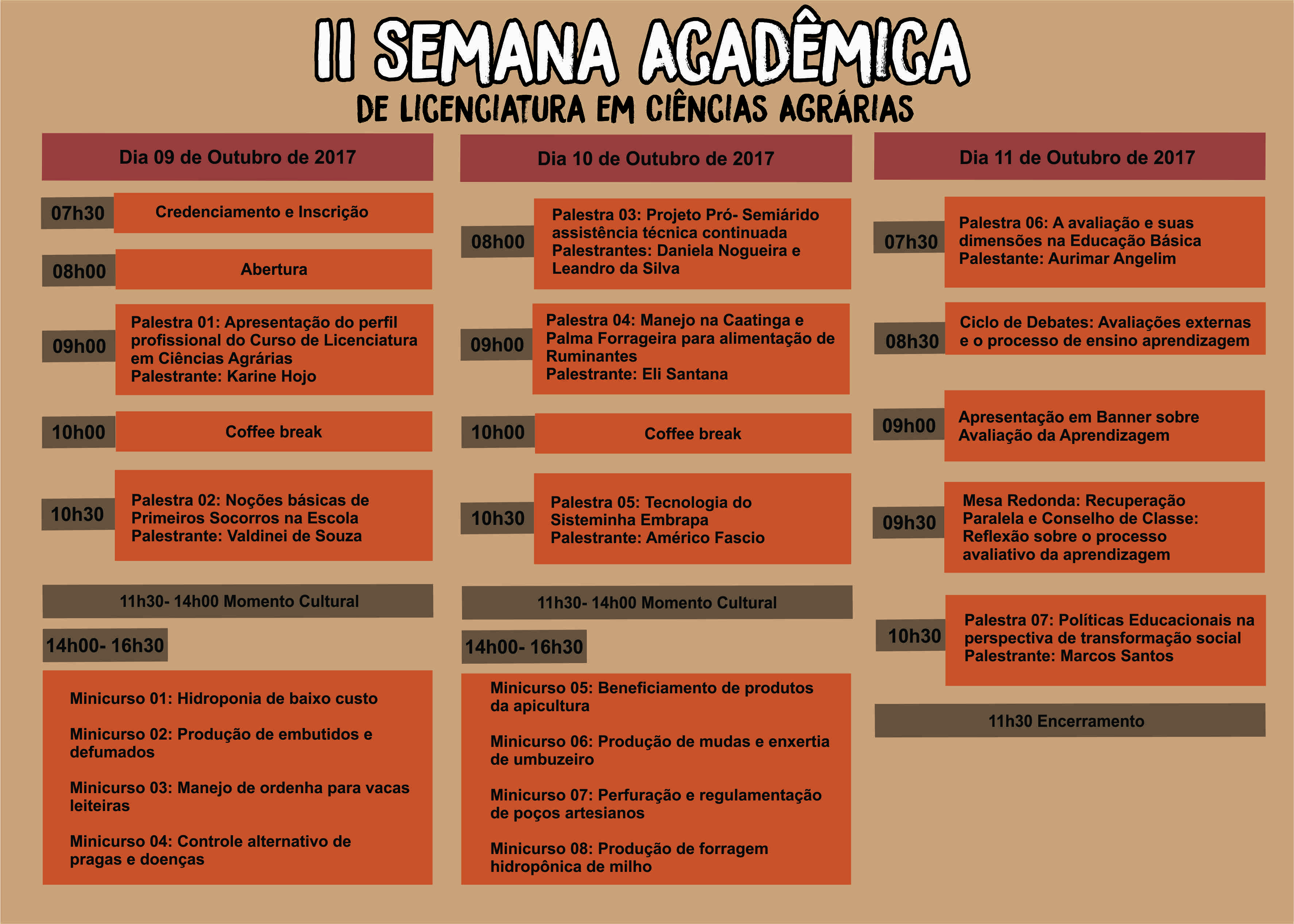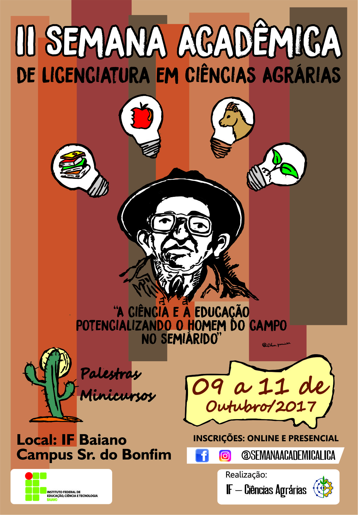 Vem aí, II Semana Acadêmica de Licenciatura em Ciências Agrárias. Este evento será realizado nos dias 09, 10, 11 de outubro no IF Baiano, Campus Senhor do Bonfim, e está sendo organizado pelos discentes do referido curso. Este contará com palestras, minicursos e outras ações voltadas para o homem do campo, tendo como objetivo: Promover a troca de saberes populares e científicos e permitir a divulgação e maior conhecimento sobre o Curso de Licenciatura em Ciências Agrárias para a comunidade de Senhor do Bonfim e região. A inscrição será realizada online com a taxa de: