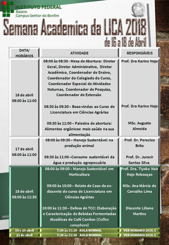 Convidamos toda a Comunidade Acadêmica para a Semana Acadêmica da Licenciatura em Ciências Agrárias (LICA) 2018.