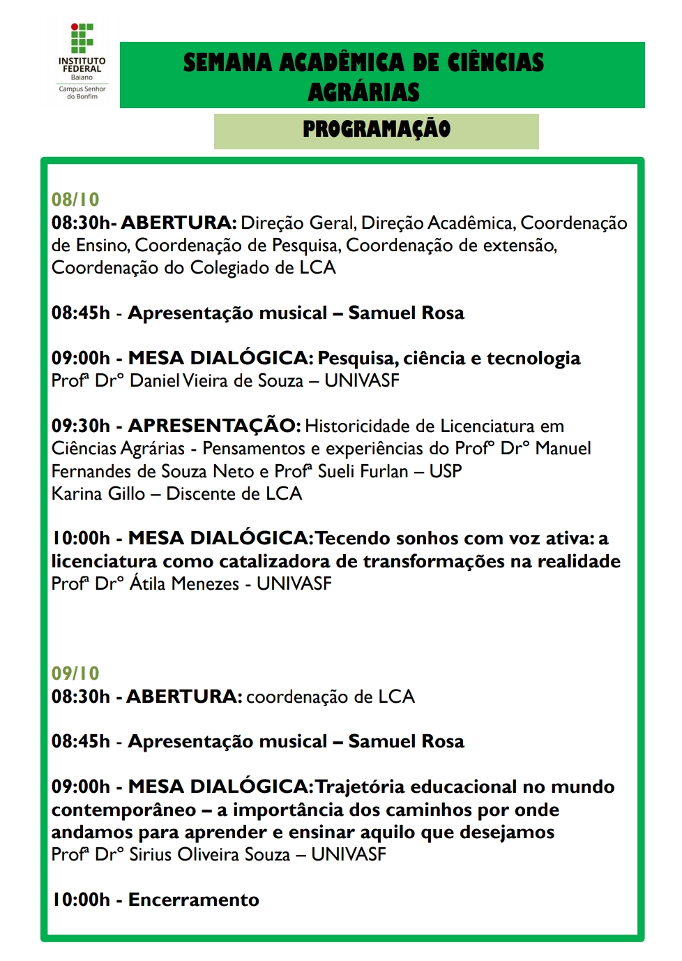 Convidamos toda a comunidade para a Semana Acadêmica de Ciências Agrárias 2018. O Evento acontecerá de 08 a 09 de outubro, no Auditório do pavilhão acadêmico do Campus Senhor do Bonfim e abordará a temática “LICENCIATURA, CIÊNCIA E TECNOLOGIA”.