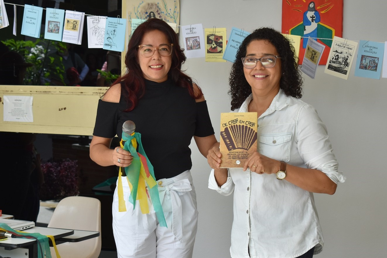 A professora Leonice Francisca de Souza, servidora do Campus Senhor do Bonfim, também abrilhantou o evento com a entrega de dois exemplares do livro “De casa em casa”, de sua autoria. A obra, resultado de sua Dissertação de Mestrado, é rica por promover um enfoque antropológico com detalhes históricos e identitários da cultura junina, especialmente, de Senhor do Bonfim. Conforme a pesquisadora: “Os personagens principais da festa são os sanfoneiros regionais, sobretudo, os de Senhor do Bonfim, aqueles que tradicionalmente tocam com os instrumentos zabumba, triângulo e a sanfona”.