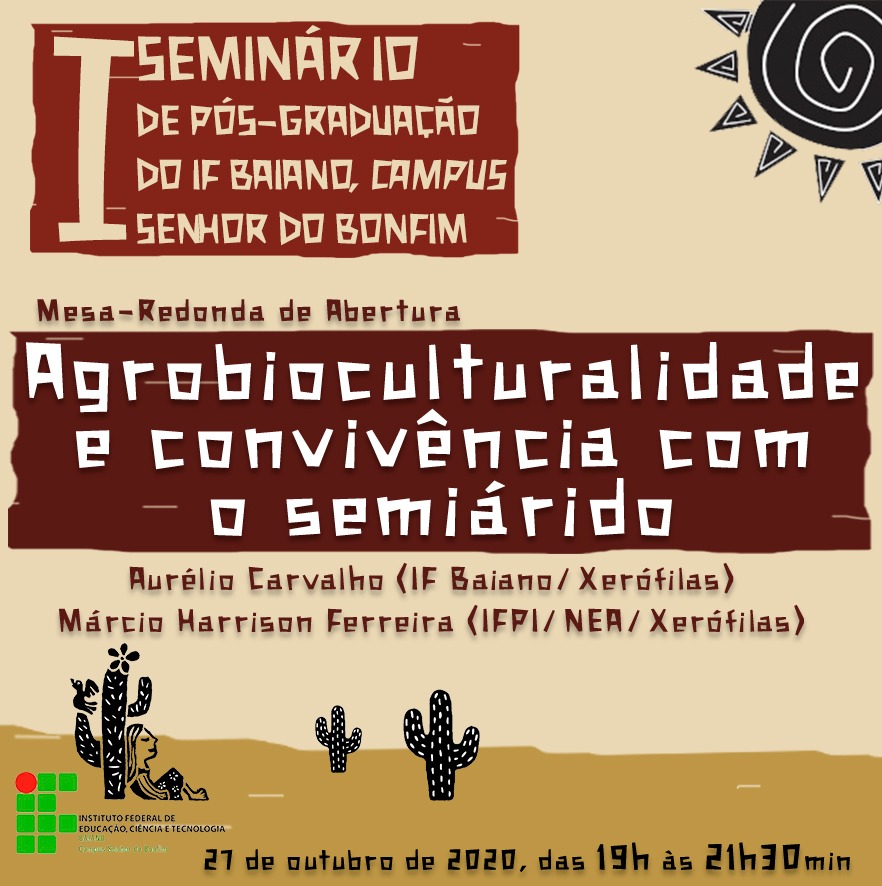 O I Seminário de Pós-Graduação do IF Baiano, Campus Senhor do Bonfim é uma ação da coordenação de pesquisa do campus e das coordenações dos cursos de Especialização em Desenvolvimento Sustentável no Semiárido com Ênfase em Recursos Hídricos – DSSERH e em Ciência e Tecnologia de Alimentos – CTA, ambas sediadas no IF Baiano, Campus Senhor do Bonfim, como uma das medidas adotadas para garantir aos pesquisadores iniciantes, que integram os corpos discentes dos cursos, a construção de um percurso formativo de qualidade, pautado no rigor científico e no atendimento das exigências técnicas próprias à ciência. Como é um espaço de e sobre práticas acadêmicas desenvolvidas no e para o Semiárido, considerando suas mais variadas dimensões, o I Seminário de Pós-Graduação do IF Baiano, Campus Senhor do Bonfim constitui-se em lócus de grande importância para pensar-se e refletir-se sobre a pesquisa e a ciência no Semiárido e examiná-las, tanto em termos do que já se tem feito, quanto em termos de suas próprias condições de produção. Coerente com isso, o evento está aberto a todas e todos os que vivem o Semiárido, nele ou para ele, independente de sua área de formação.