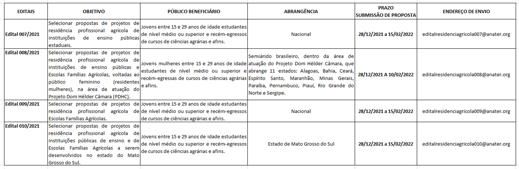 Em referência ao lançamento dos Editais 07, 08, 09 e 10/2021 do Programa de Residência Profissional Agrícola (AgroResidência), destinados à qualificação técnica de estudantes e recém-egressos de cursos de ciências agrárias e áreas afins.