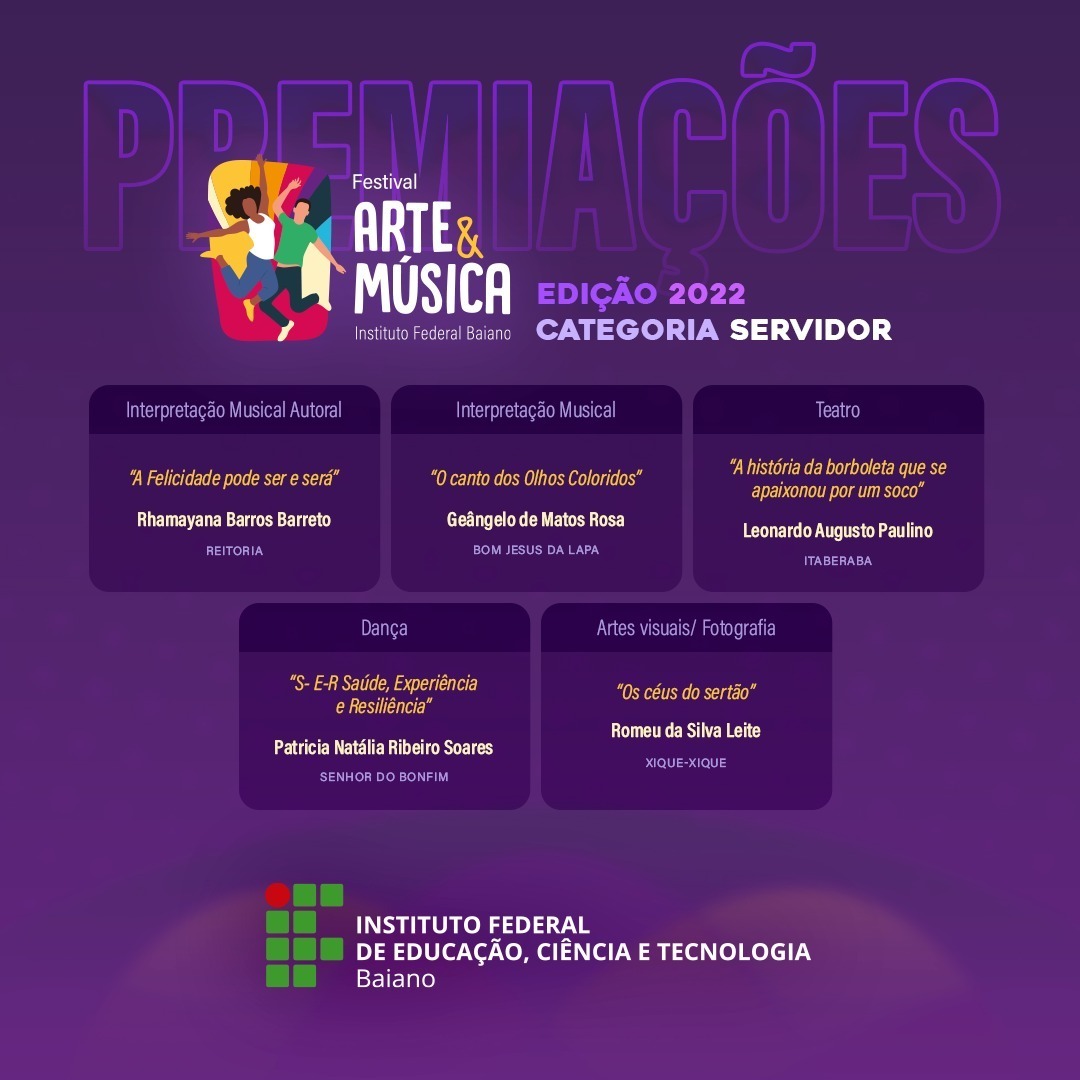 1º Lugar no FESTIVAL DE ARTE E MÚSICA DO IF BAIANO (FAMIF) – Categoria Servidor – Formato: Dança. Título da apresentação: S- E-R Saúde, Experiência e Resiliência.