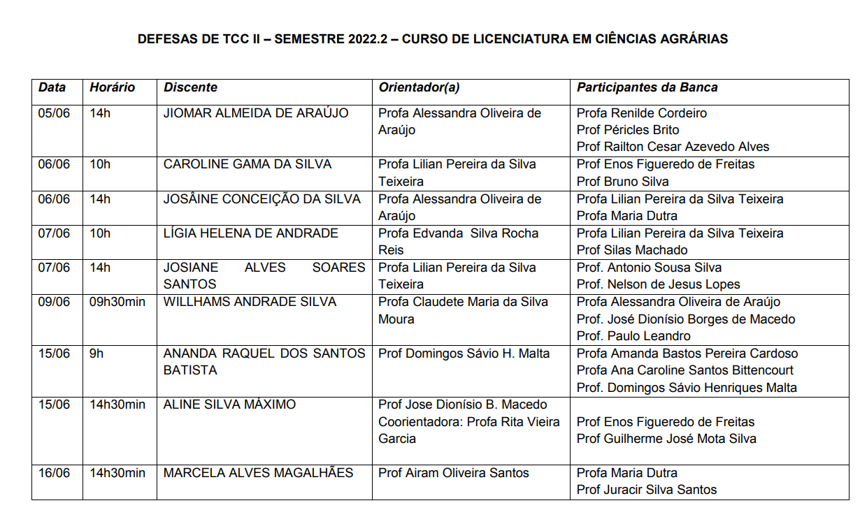 As defesas de Trabalho de Conclusão de Curso – TCC de Licenciatura em Ciências Agrárias, ocorrerão entre os dias 5 e 16 de junho, na modalidade presencial, nas salas do Pavilhão de Aulas do Campus de Senhor do Bonfim. Confira as defesas agendadas abaixo: