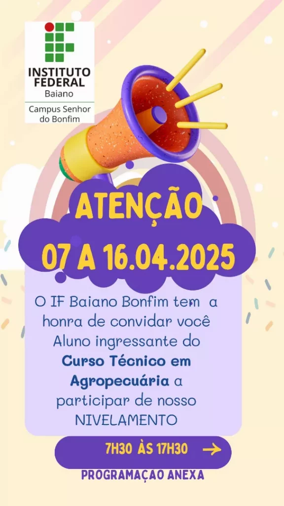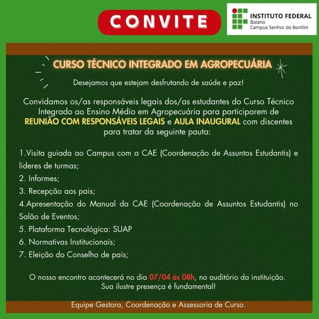A programação começa às 08h de 07/04, com a reunião de pais e responsáveis dos ingressantes do curso Técnico em Agropecuária Integrado no auditório do IF Baiano – Campus senhor do Bonfim. Logo depois, haverá Aula Inaugural com os discentes.
