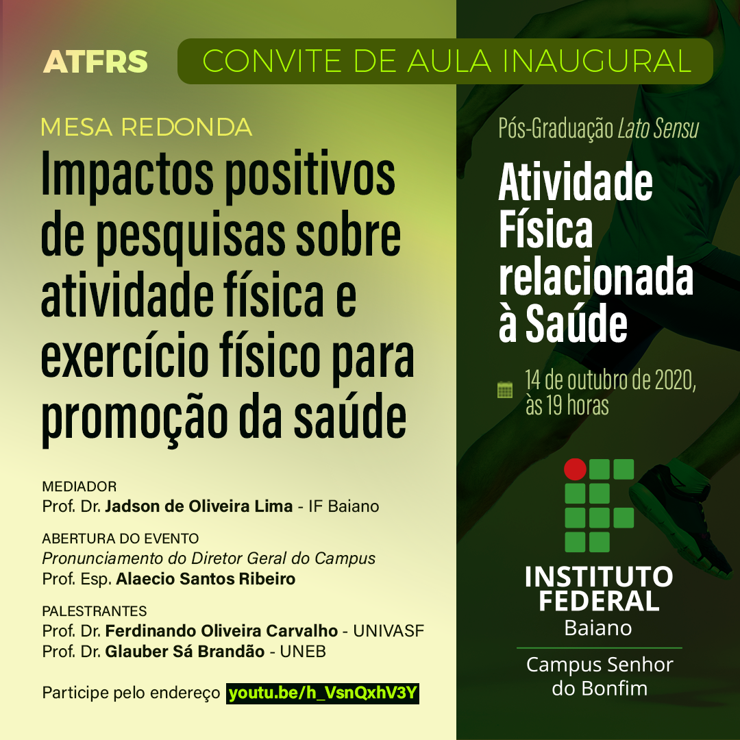O curso de Pós-Graduação Lato Sensu em Atividade Física Relacionada à Saúde – ATFRS é promovido pelo Instituto Federal de Educação, Ciência e Tecnologia Baiano – IF BAIANO/Campus Senhor do Bonfim, com apoio da Pró-Reitoria de Pesquisa e Inovação do IF Baiano.