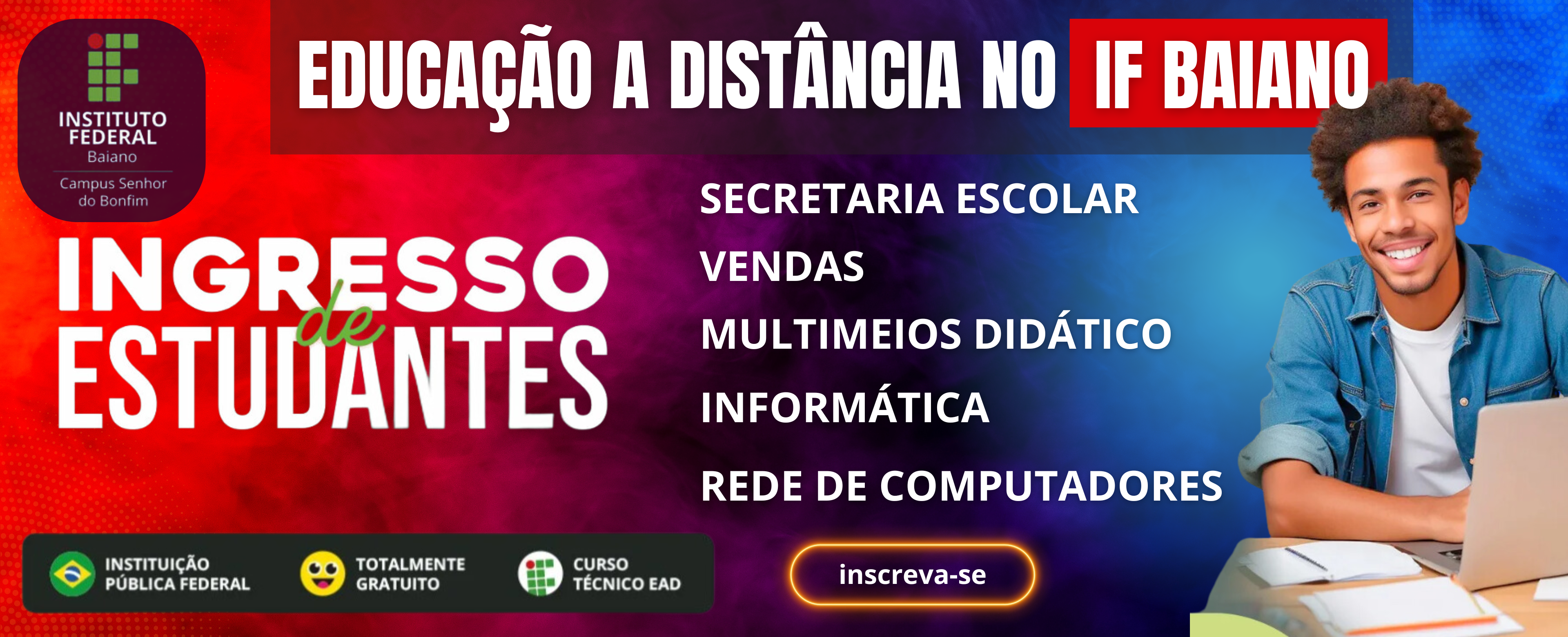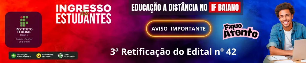 O DIRETOR-GERAL DO INSTITUTO FEDERAL DE EDUCAÇÃO, CIÊNCIA E TECNOLOGIA BAIANO (IF BAIANO) CAMPUS SENHOR DO BONFIM, no uso de suas atribuições, torna pública a abertura de inscrições para o processo de ingresso de estudantes de 2025, dos cursos da Educação Profissional Técnica de Nível Médio (EPTNM), na forma subsequente ao ensino médio – modalidade a EaD, conforme o número de vagas e os cursos relacionados no Quadro 2 do subitem 2.2 e seguindo as demais condições e etapas definidas no Edital Nº 42, de 30 de setembro de 2024