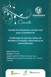 No dia 16 de junho de 2015, o IF BAIANO Campus Catu estará certificando produtoras rurais das Associações de Produtores Rurais das comunidades Viadinho, Flechas e Pedras no município de Catu que participaram do curso de extensão “Cultura da Mandioca: Produção e Alternativas de Comercialização”.