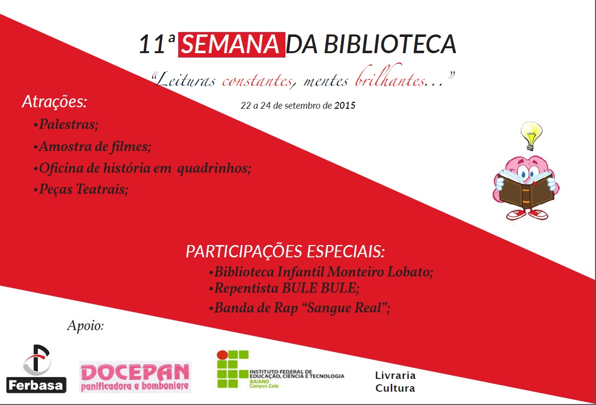 Um dos pontos altos do evento são os concursos, onde há participação efetiva dos alunos do Campus, bem como das escolas públicas e particulares da comunidade local. Este ano, a programação contará também com a participação do cordelista e repentista baiano Bule Bule que realizará uma palestra cantada. Teremos também, a colaboração do INEMA (Instituto de Meio Ambiente e Recursos Hídricos) que realizará a palestra de abertura do evento e da Banda de Rap “Sangue Real” que encerrará a 11ª Semana da Biblioteca.