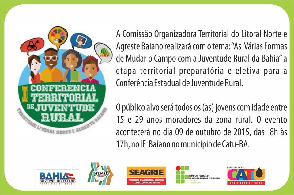 Com o tema “As Várias Formas de Mudar o Campo com a Juventude Rural do Território do Litoral Norte e Agreste Baiano”, a Iª Conferência Territorial de Jovens Rurais do Litoral Norte e Agreste Baiano, será sediada no IF Baiano – Campus Catu, com a proposta de debater junto com a juventude a importância desta para transformação do meio rural. O evento contará com diálogo com a plenária e grupos temáticos.