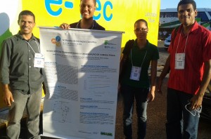 Da esquerda para direita, Prof. Gilvan Durães e alunos do curso de ADS (Jardel Santana, Clécia Santos e Ueslem Pereira) apresentando trabalho de pesquisa na IV Mostra de Iniciação Científica do IF Baiano (MIC 2015, Ilhéus).