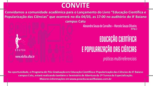 Durante o evento, também será lançado o Livro – “Educação Científica e Popularização das Ciências: práticas multirreferenciais” (EDUFBA, 2016) – organizado pelos professores, Marcelo Oliveira e Alexandra Carvalho. A obra é uma coletânea de artigos de autoria de pesquisadores do IF Baiano e, de diversas instituições brasileiras, com temáticas voltadas paras reflexões sobre teorias e práticas acerca da educação científica.