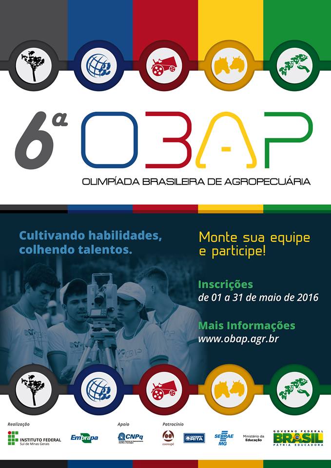 As inscrições, para a 6ª Olimpíada Brasileira de Agropecuária (OBAP) seguem abertas, até o dia 30/05/2016. Poderão se inscrever estudantes do Ensino Médio Integrado ou Concomitante aos Cursos Técnico em Agropecuária; Técnico em Alimentos; Técnico em Agroindústria e os demais cursos do Eixo Tecnológico Recursos Naturais (Catálogo Nacional de Cursos Técnicos, disponível em: catalogonct.mec.gov.br/)