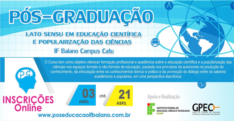 O IF Baiano – Campus Catu informa, que no período de 03 a 21 de abril de 2017, estarão abertas as inscrições, para o processo seletivo, para o ingresso no curso de Pós-graduação Lato Sensu em Educação Científica e Popularização das Ciências. Os (as) estudantes selecionados (as) integrarão a turma 2017.2.