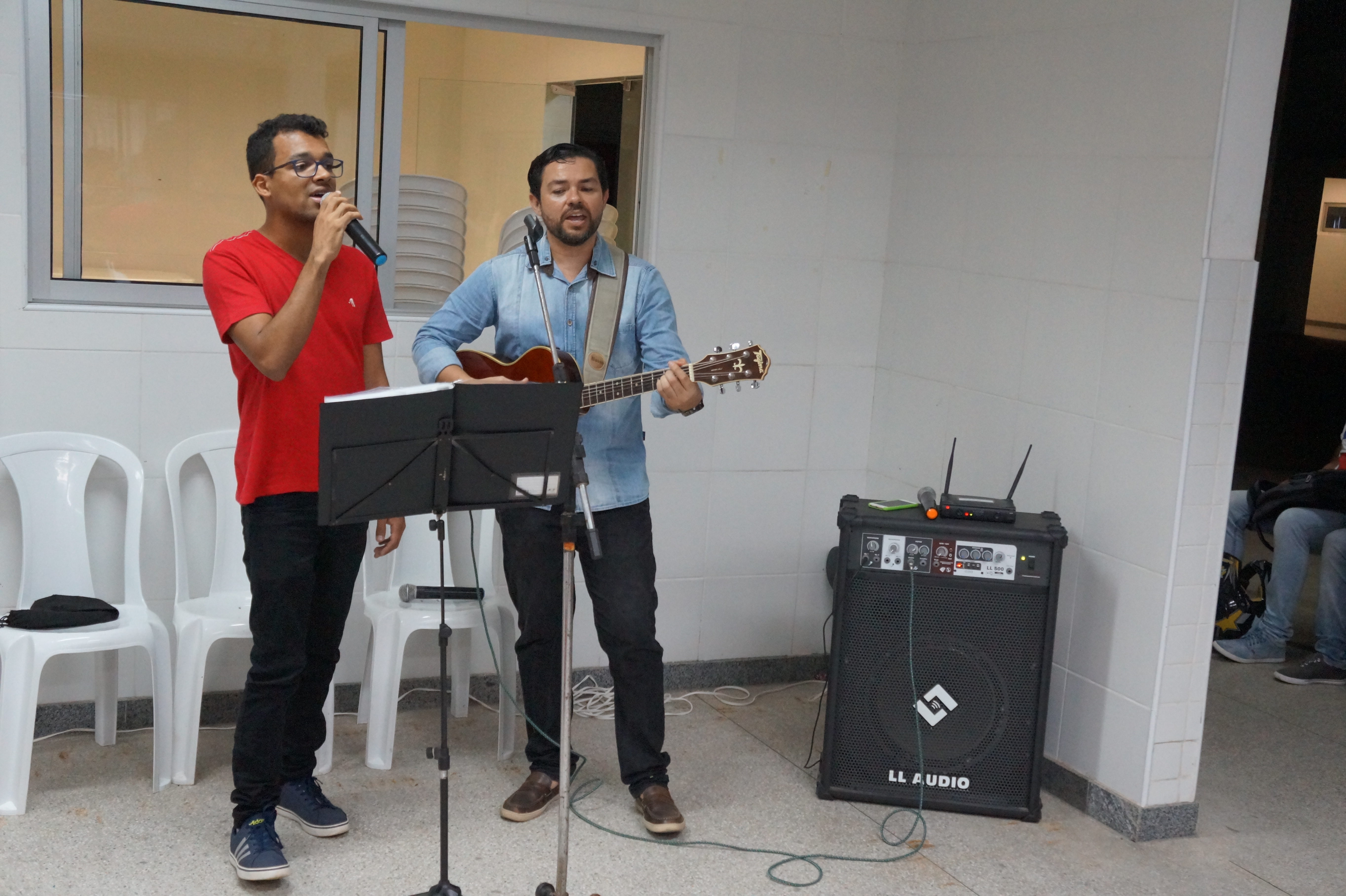 Em seguida, os estudantes foram dirigidos para o pátio do pavilhão de aulas II onde puderam degustar o Cofffebreak preparado para eles e ouvir a apresentação musical do professor Fernando Martins e do aluno