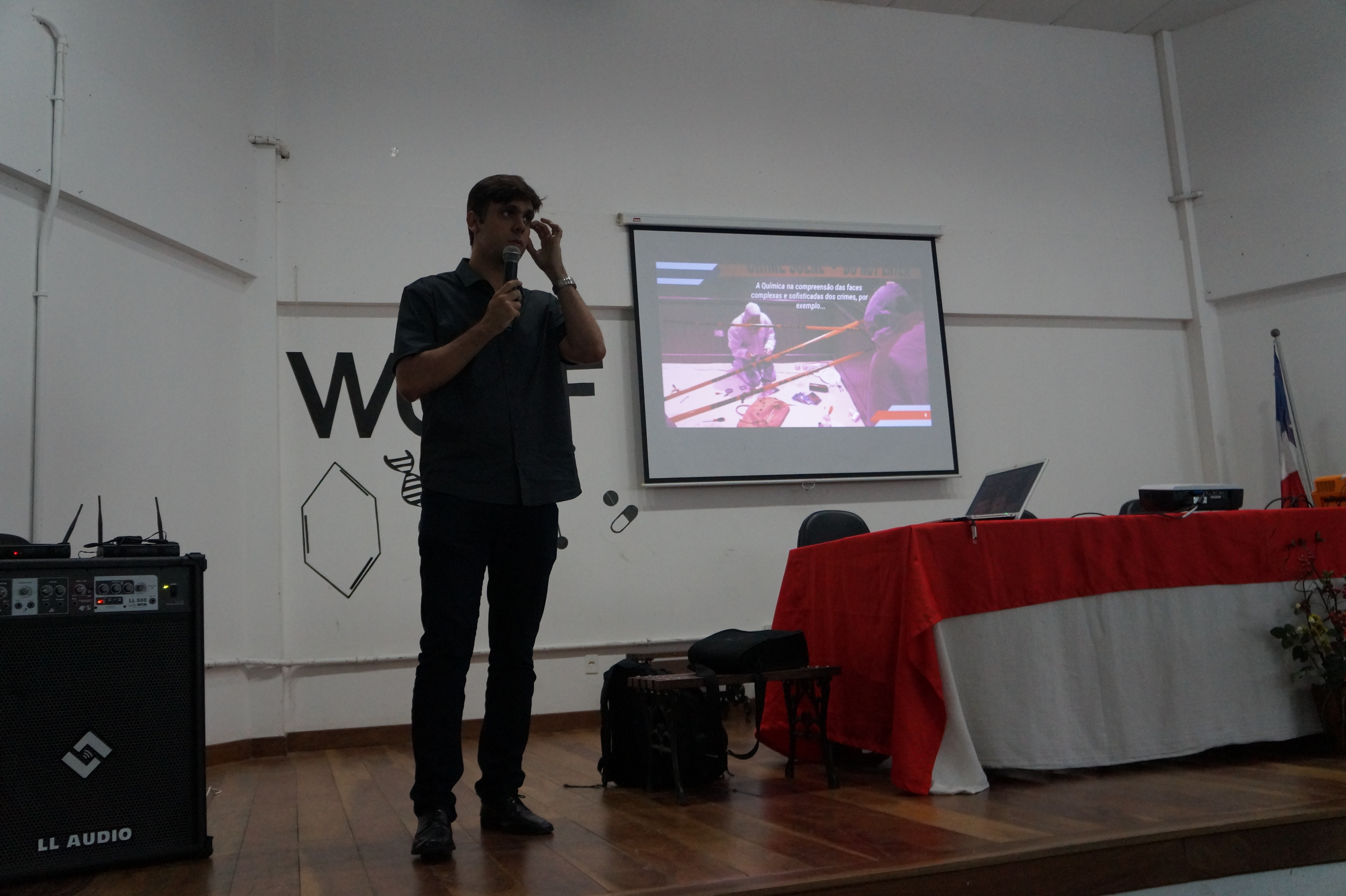 O evento iniciou com as falas do coordenador do curso de Licenciatura em Química André Fazolo, da professora organizadora do evento Fátima Sanches e da Diretora Acadêmica, substituindo a Diretora Geral, Alexandra Carvalho.