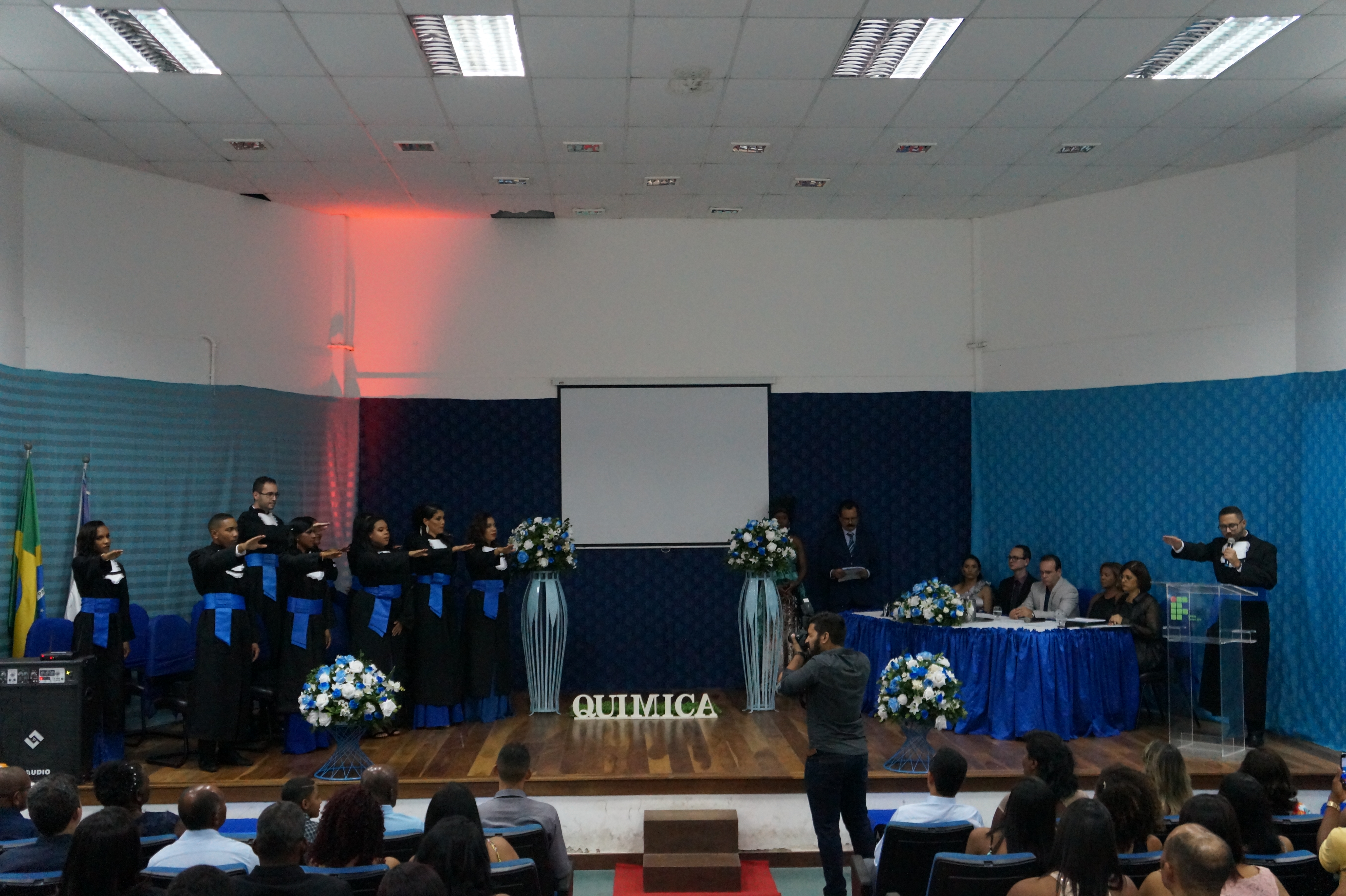 Na sexta-feira, 17 de maio de 2019, no auditório do Pavilhão de Aulas II do Instituto Federal Baiano campus Catu, aconteceu a formatura dos alunos do curso de Licenciatura em Química do semestre 2018.2 turma Professor Antônio Leonan. Compuseram a mesa Marcelito Trindade, representando o Reitor, a Diretora Geral do campus Sandra Cerqueira, o coordenador do curso André Fazolo, a coordenadora da Secretaria de Registros Acadêmicos Rita Borges e a paraninfa da turma e Diretora Acadêmica Alexandra Carvalho. O evento contou com a presença dos professores do curso e dos familiares dos estudantes. Os professores Antônio Leonan, nome da turma, Fátima Sanches, Aline Porto e Alexandra Carvalho, paraninfa da turma, foram homenageados com uma placa pelo sua dedicação e trabalho de destaque no curso. O IF Baiano Catu parabeniza a todos os estudantes pela sua conquista e deseja a todos boa sorte nessa nova jornada em suas vidas.