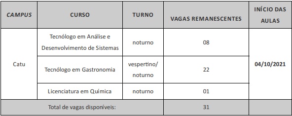 O campus Catu esta com 31 vagas remanescentes da seleção do Sisu 2021.1