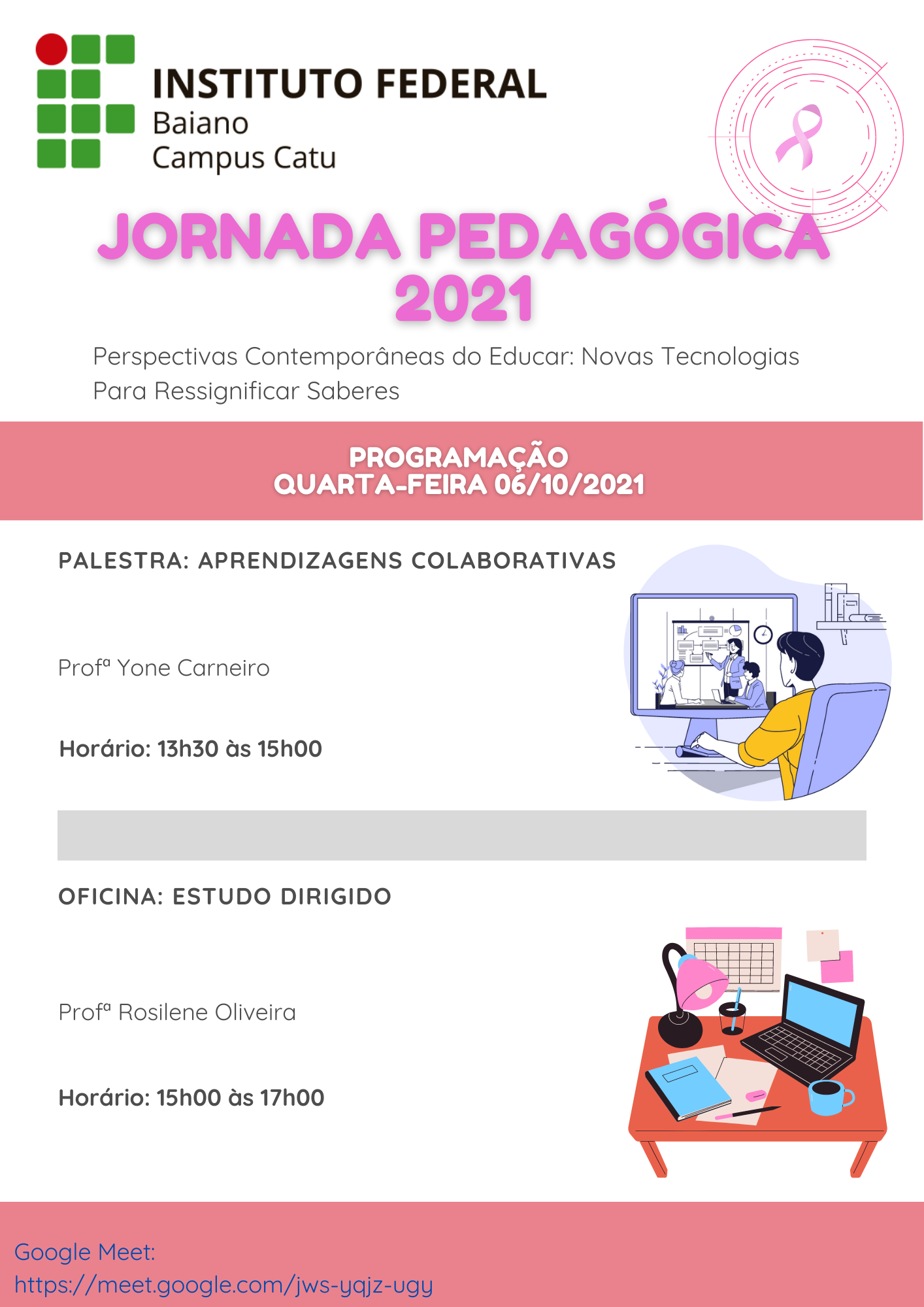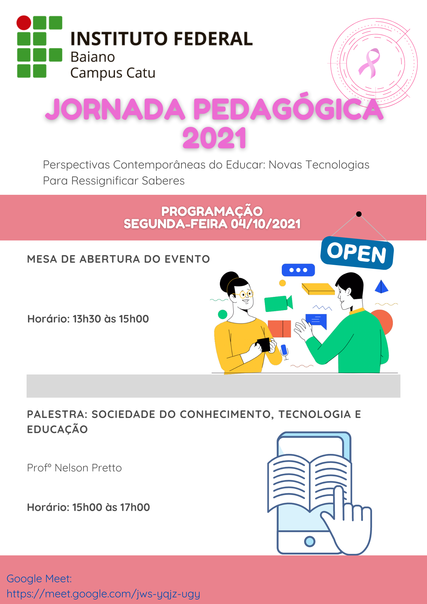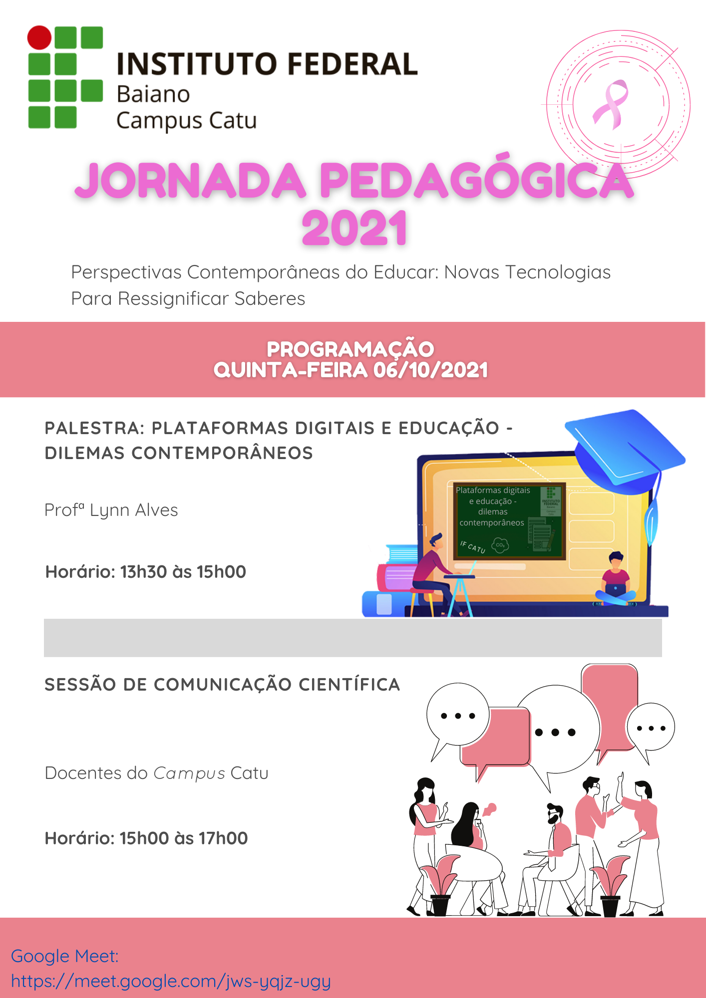 “Perspectivas contemporâneas do educar: novas tecnologias para ressignificar saberes”. Com este tema convidamos toda a comunidade acadêmica do IF Baiano campus Catu a refletir sobre os caminhos pedagógicos que temos traçado e os saberes que queremos alcançar, em um contexto de desafios, mas também de muita colaboração e de busca coletiva para superação e inovação.