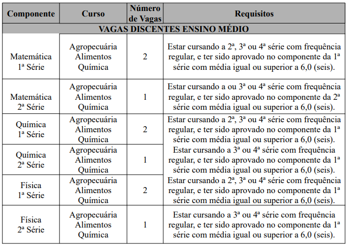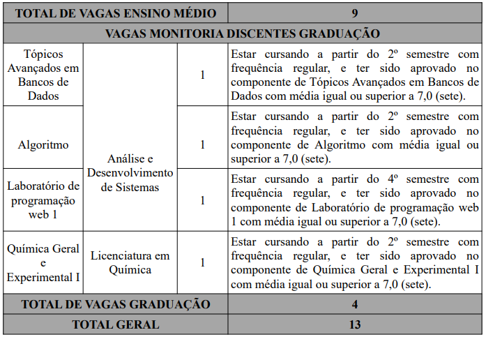 Estão abertas 13 vagas de monitoria remunerada, para discentes do ensino médio e superior, conforme inscritos no quadro abaixo;