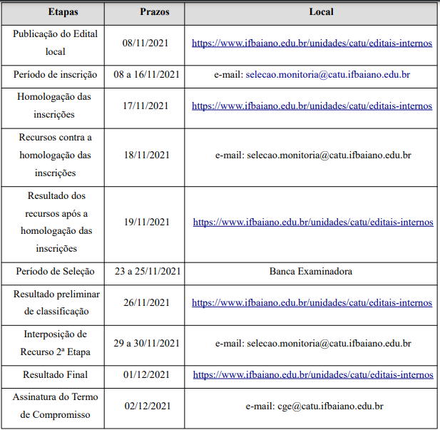 As inscrições deverão ser realizadas no período de 08 a 16 de novembro de 2021, de forma não presencial, por meio de correspondência eletrônica enviada ao endereço: selecao.monitoria@catu.ifbaiano.edu.br