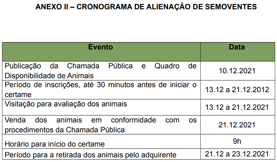 Da vistoria prévia dos animais: interessados inscritos no certame poderão vistoriar os animais, em dias que antecedem o certame, nas Unidades Educativas de Campo ( Zootecnia II), subordinadas à Coordenação das Unidades Educativas de Campo, localizada na rua Barão de Camaçari, 108 Bairro Barão de Camaçari, município de Catu exclusivamente no período fixado pelo Cronograma de Alienação de Semoventes (Anexo II), mediante agendamento pelo telefone (71) 3641-7908 ou pelo e-mail: alienacao.semoventes@catu.iPaiano.edu.br