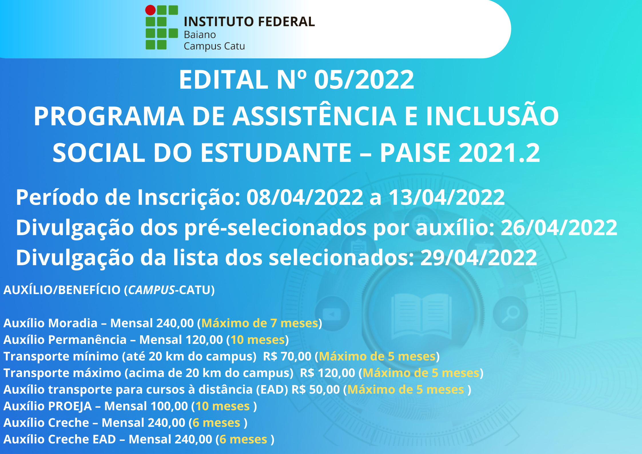 A Diretora do Instituto Federal de Educação, Ciência e Tecnologia Baiano – IF Baiano Campus Catu, nomeado pela portaria nº 378 de 23/03/2022, publicado no DOU de 24/03/2022, e de acordo com as disposições contidas na Lei nº 11.892, de 29/12/2008, e na Lei nº 8.112, de 11/12/1990, considerando ainda o Decreto n° 7.234/2010 e a Resolução Nº 01, de 29 de janeiro de 2019, que institui a Política de Assistência Estudantil no âmbito do IF Baiano, torna público o presente Edital que estabelece as normas e critérios para seleção de estudantes em vulnerabilidade socioeconômica, de cursos presenciais e à distância, com a finalidade de participação na Política de Assistência Estudantil deste Instituto, por meio do PAISE.