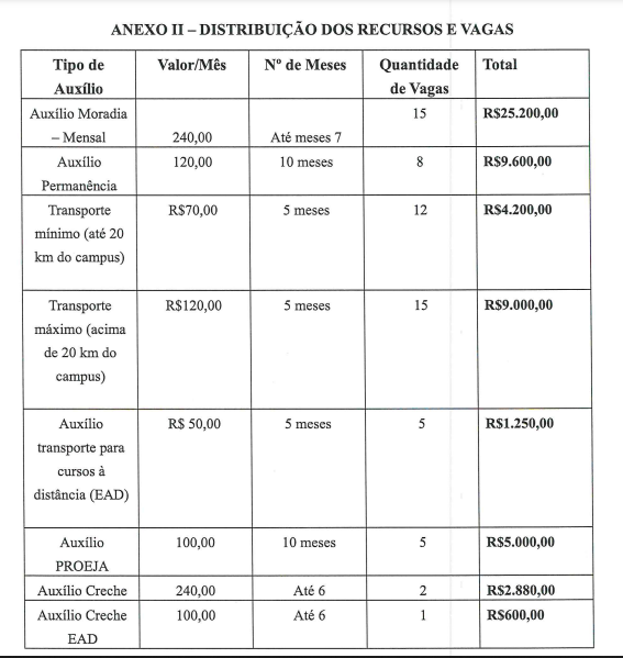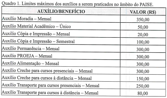 Os valores dos Auxílios a serem praticados no âmbito do PAISE serão definidos a critério do campus, respeitando as especificações no quadro a seguir: