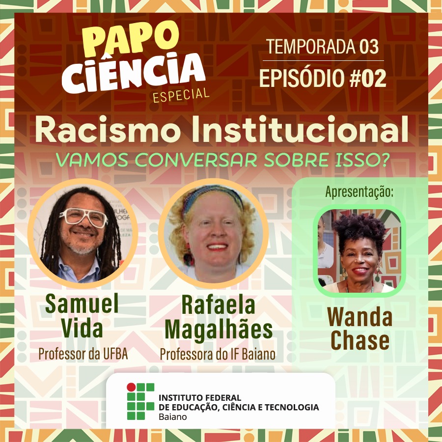 #PraTodosVerem Card com fundo colorido, predominando as cores marrom, amarelo, vermelho e verde. No topo, está escrito “Papo Ciência Especial. Temporada 03 | Episódio #02”. Abaixo, em destaque, consta “Racismo Institucional – Vamos conversar sobre isso?” Abaixo, aparecem as fotos dos rostos de Samuel Vida, professor da UFBA, Rafaela Magalhães, professora do IF Baiano e Wanda Chase, apresentadora. Na barra do card, há a marca do IF Baiano. Fim da descrição.