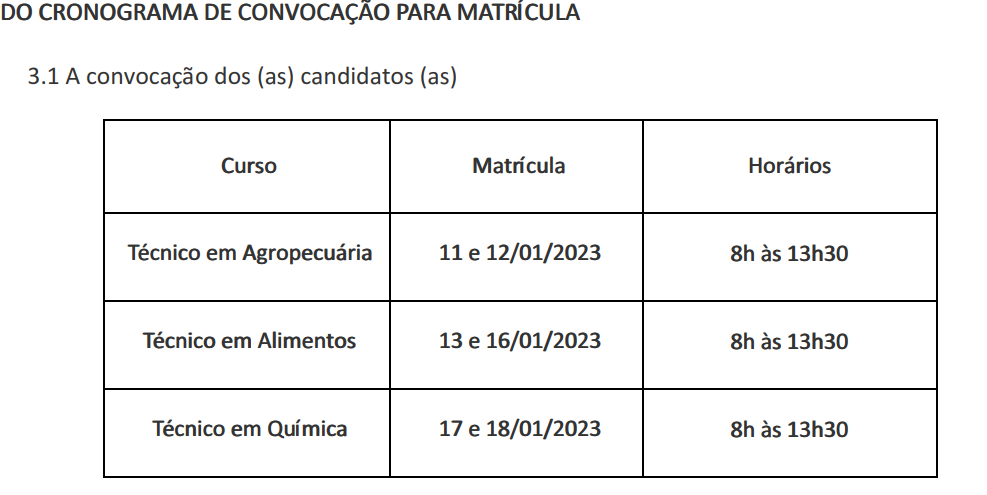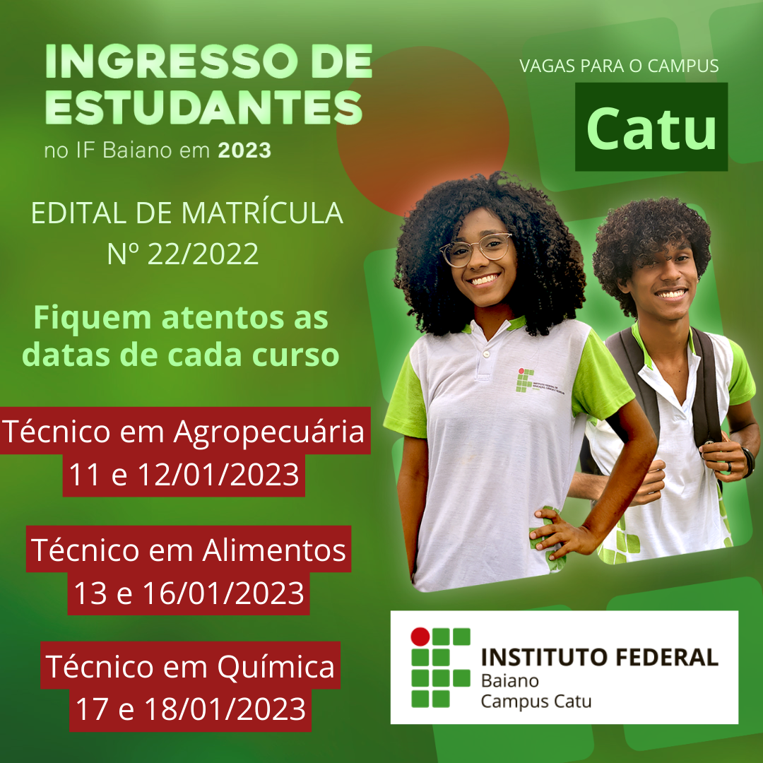A DIRETORA-GERAL DO INSTITUTO FEDERAL DE EDUCAÇÃO, CIÊNCIA E TECNOLOGIA BAIANO – CAMPUS CATU, no uso das suas atribuições legais, conferidas pela Portaria n. 276, de 18 de março de 2022, publicada no DOU de 21/03/2022, e de acordo com as disposições contidas na Lei nº 11.892, de 29/12/2008, e na Lei nº 8.112, de 11/12/1990, convoca os(as) candidatos(as) aprovados (as) no processo para ingresso de estudantes em 2023, Curso Técnico Integrado ao Ensino Médio em Agropecuária , Alimentos e Química, na modalidade Presencial , para matrícula.