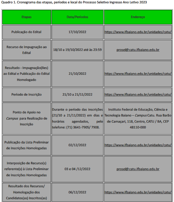 INSCRIÇÕES PROCESSO SELETIVO PARA INGRESSO DE ESTUDANTES 2023 – CURSOS INTEGRADOS – CAMPUS CATU