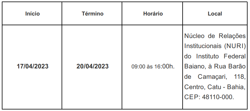 Reitoria: Rua do Rouxinol, nº 115, Imbuí, Salvador-BA. CEP: 41720-052. CNPJ: 10.724.903/0001-79 Telefone: (71) 3186-0001 | E-mail: gabinete@ifbaiano.edu.br