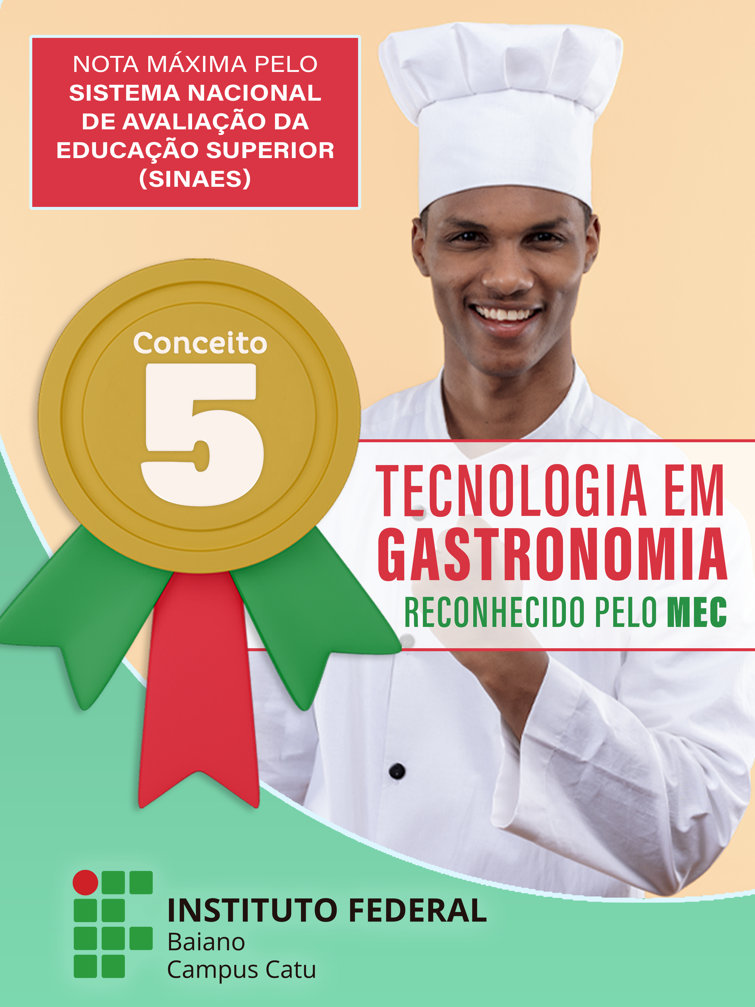 O curso superior Tecnológico em Gastronomia do campus Catu é um dos quatro cursos do IF Baiano que acabam de ser reconhecidos pelos MEC com conceito 5. Essa nota representa máxima excelência e é com grande satisfação que compartilhamos essa notícia com a comunidade.