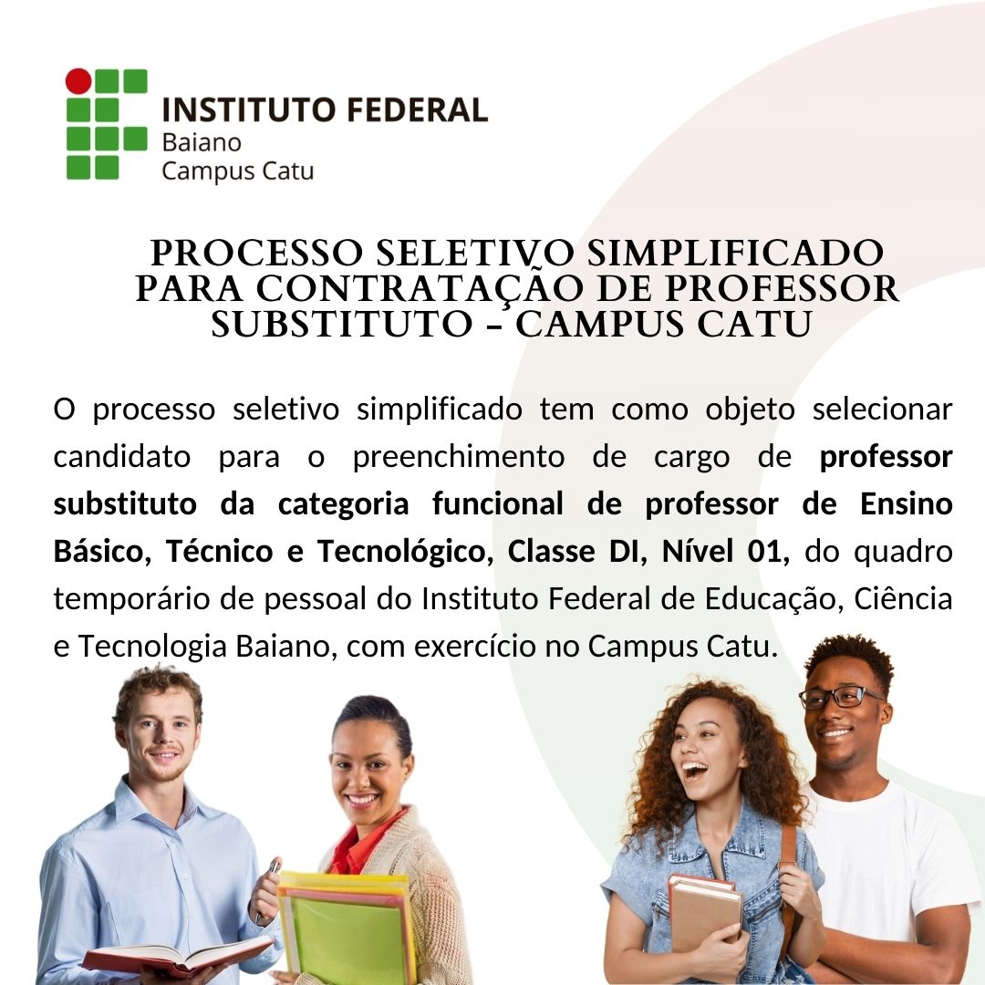 1.1 O processo seletivo simplificado tem como objeto selecionar candidato para o preenchimento de cargo de professor substituto da categoria funcional de professor de Ensino Básico, Técnico e Tecnológico, Classe DI, Nível 01, do quadro temporário de pessoal do Instituto Federal de Educação, Ciência e Tecnologia Baiano, com exercício no Campus Catu.