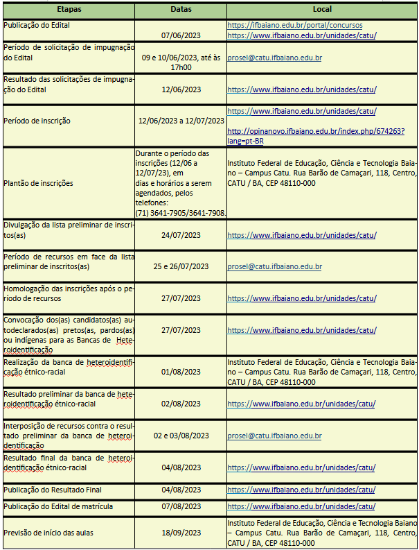 A DIRETORA GERAL DO INSTITUTO FEDERAL DE EDUCAÇÃO, CIÊNCIA E TECNOLOGIA BAIANO (IF BAIANO) CAMPUS Catu, no uso de suas atribuições delegadas pela Portaria Nº 276 de 18 de março de 2022, publicada no Diário Oficial da União do dia 21 de março de 2022, Seção 2, página 26, e de acordo com as disposições conAdas na Lei Nº 11.892, de 29 de dezembro de 2008; e na Lei Nº 8.112, de 11 de dezembro de 1990; em conformidade com a Lei Nº 9.394, de 20 de dezembro de 1996, e suas alterações; e, ainda, considerando a Resolução CNE/CP Nº 04, de 17 de dezembro de 2018; o Decreto Nº 6.135, de 26 de junho de 2007; a Lei Nº 8.666, de 21 de junho de 1993; o Decreto Nº 3.298, de 20 de dezembro de 1999; a Lei Nº 12.764, de 27 de dezembro de 2012; a Lei Nº 12.711, de 29 de agosto de 2012, e suas regulamentações; a Lei Nº 10.741, de 1º de outubro de 2003; a Lei Nº 13.409, de 28 de dezembro de 2016; o Decreto Nº 7.824, de 11 de outubro de 2012; e a Portaria do Ministério da Educação (MEC) Nº 18, de 11 de outubro de 2012, e suas alterações, torna pública a abertura de inscrições no processo de ingresso de estudantes de 2023 nos cursos da Educação Profissional Técnica de Nível Médio Subsequente, na modalidade presencial, no Campus Catu, conforme o número de vagas e os cursos relacionados no Quadro 2 do subitem 7.1 deste Edital.