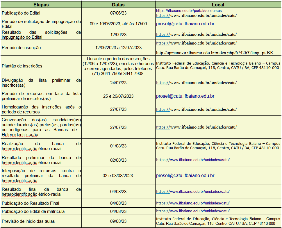 A DIRETORA GERAL DO INSTITUTO FEDERAL DE EDUCAÇÃO, CIÊNCIA E TECNOLOGIA BAIANO (IF BAIANO) CAMPUS Catu, no uso de suas atribuições delegadas pela Portaria Nº 276 de 18 de março de 2022, publicada no Diário Oficial da União do dia 21 de março de 2022, Seção 2, página 26, e de acordo com as disposições con@das na Lei Nº 11.892, de 29 de dezembro de 2008; e na Lei Nº 8.112, de 11 de dezembro de 1990; em conformidade com a Lei Nº 9.394, de 20 de dezembro de 1996, e suas alterações; e, ainda, considerando a Resolução CNE/CP Nº 04, de 17 de dezembro de 2018; o Decreto Nº 6.135, de 26 de junho de 2007; a Lei Nº 8.666, de 21 de junho de 1993; o Decreto Nº 3.298, de 20 de dezembro de 1999; a Lei Nº 12.764, de 27 de dezembro de 2012; a Lei Nº 12.711, de 29 de agosto de 2012, e suas regulamentações; a Lei Nº 10.741, de 1º de outubro de 2003; a Lei Nº 13.409, de 28 de dezembro de 2016; o Decreto Nº 7.824, de 11 de outubro de 2012; e a Portaria do Ministério da Educação (MEC) Nº 18, de 11 de outubro de 2012, e suas alterações, torna pública a seleção de estudantes para provimento de vagas no Curso Técnico Integrado ao Ensino Médio em Gastronomia, na Modalidade da Educação de Jovens e Adultos – PROEJA, deste Ins@tuto, para ingresso no ano de 2023.